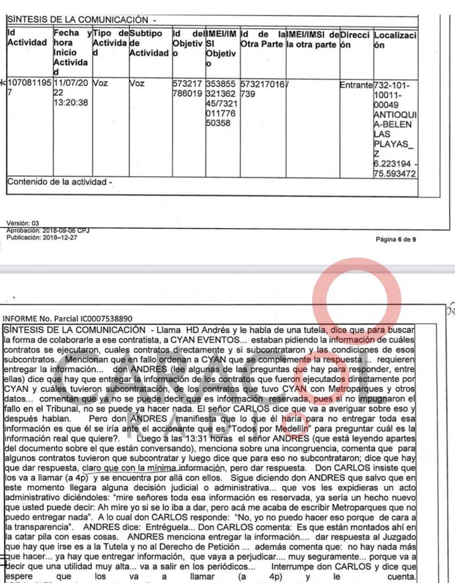 Otra de las interceptaciones, esta vez al teléfono de Carlos Jaramillo, uno de los abogados de Metroparques. La fecha de la interceptación es el 11 de julio del 2022; a la 1:20 de la tarde, donde se observa que un hombre desconocido identificado como Andrés habla de la tutela al abogado y miran la manera de ayudarle a Cyan a contestar las preguntas de Todos por Medellín.