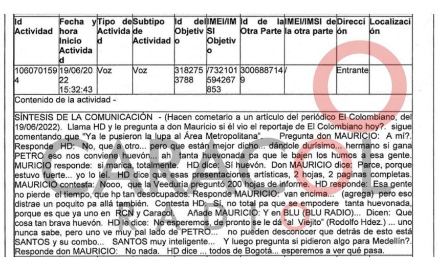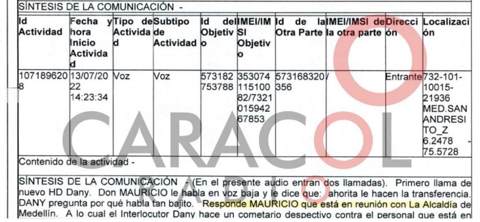 En otra interceptación del mismo 13 de julio del 2022, a las 2:23 de la tarde, donde Mauricio Jaramillo dice que está reunido con la alcaldía; una reunión que coincide con una decisión de tutela que obligaba a Cyan a entregar una información a la Veeduría Todos por Medellín.