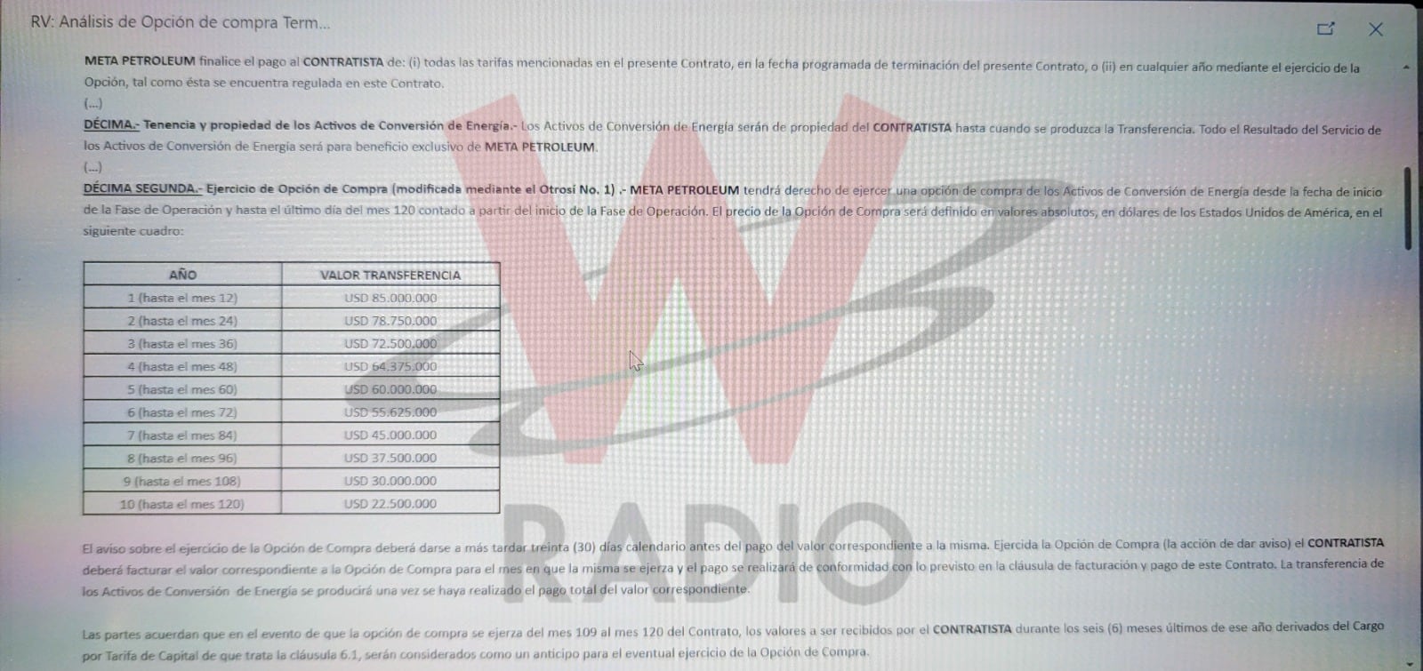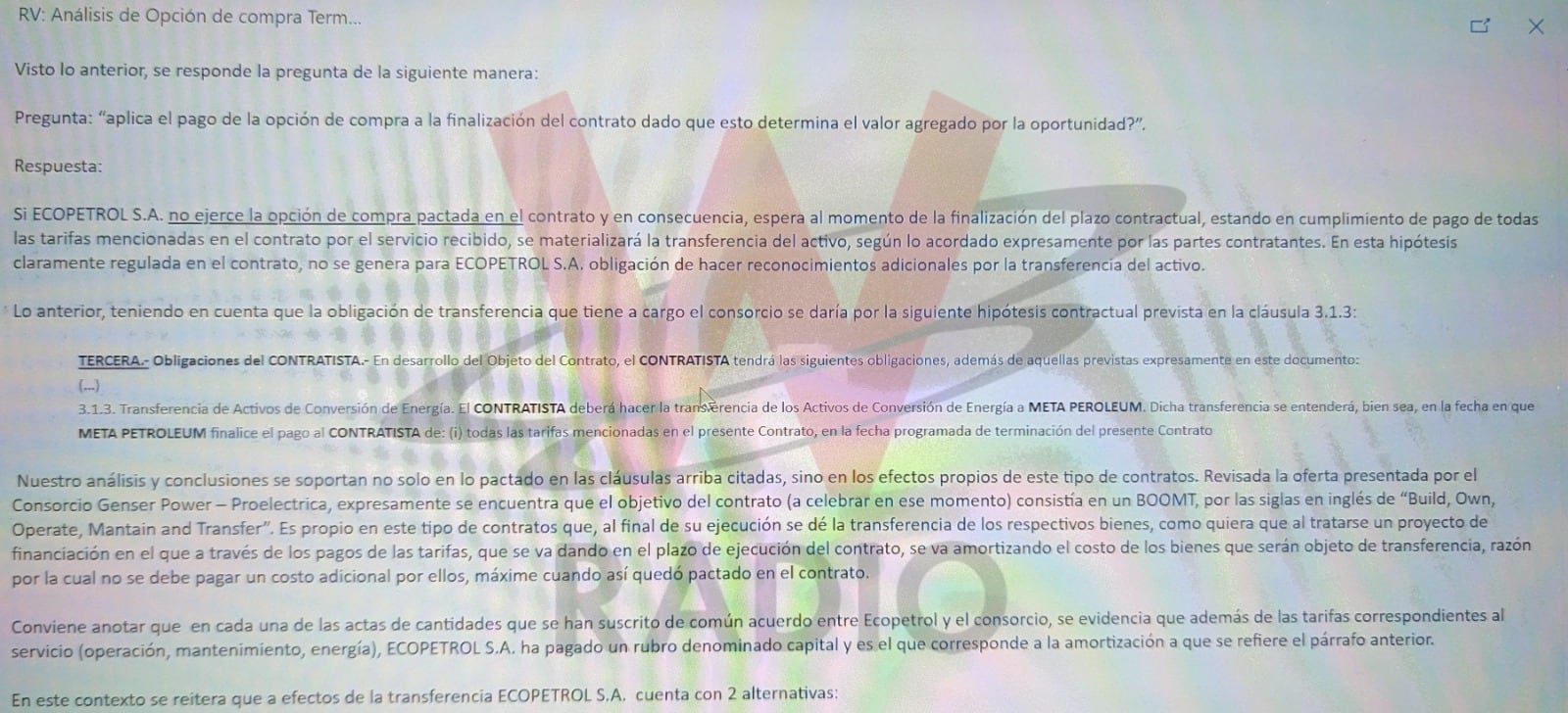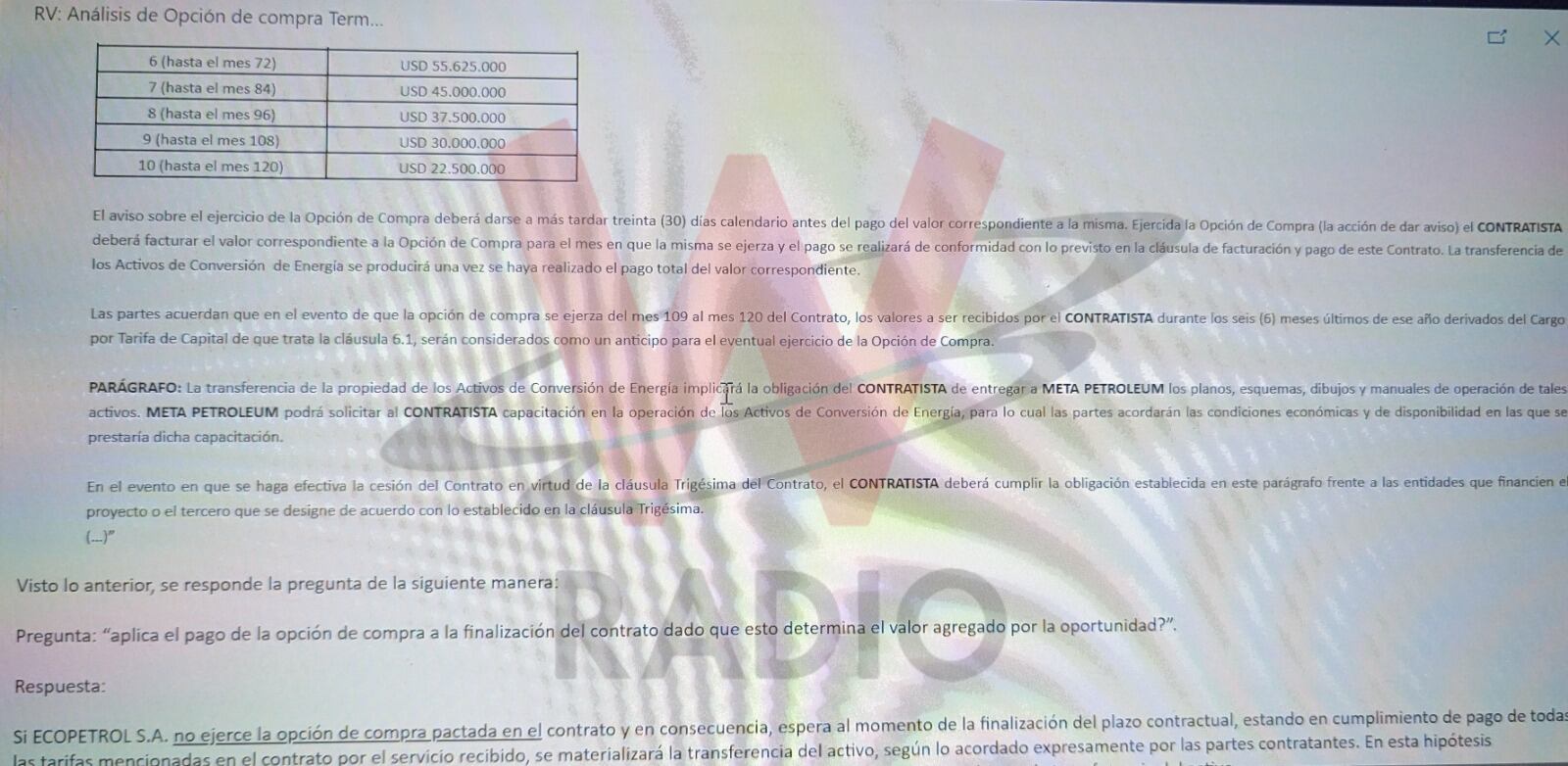 A pesar de que el pasado 6 de junio de este año, el vicepresidente de energía de Ecopetrol, David Riaño, dijo en La W que la empresa petrolera no había pagado de manera irregular al empresario William Vélez 42 millones de dólares por concepto de las plantas de generación de energía Termomorichal I y II, argumentando que “nosotros obviamente hicimos toda la debida diligencia, esto que yo les digo tiene análisis financieros, tiene análisis jurídicos donde a detalle obviamente se analiza cada opción para determinar qué es lo mejor para el grupo Ecopetrol”, La W tuvo acceso a los correos internos de Ecopetrol que desde el 8 de noviembre de 2018 dejaba resuelta la duda sobre si la empresa debía o no pagar por dichas plantas al término del plazo definido en el contrato.