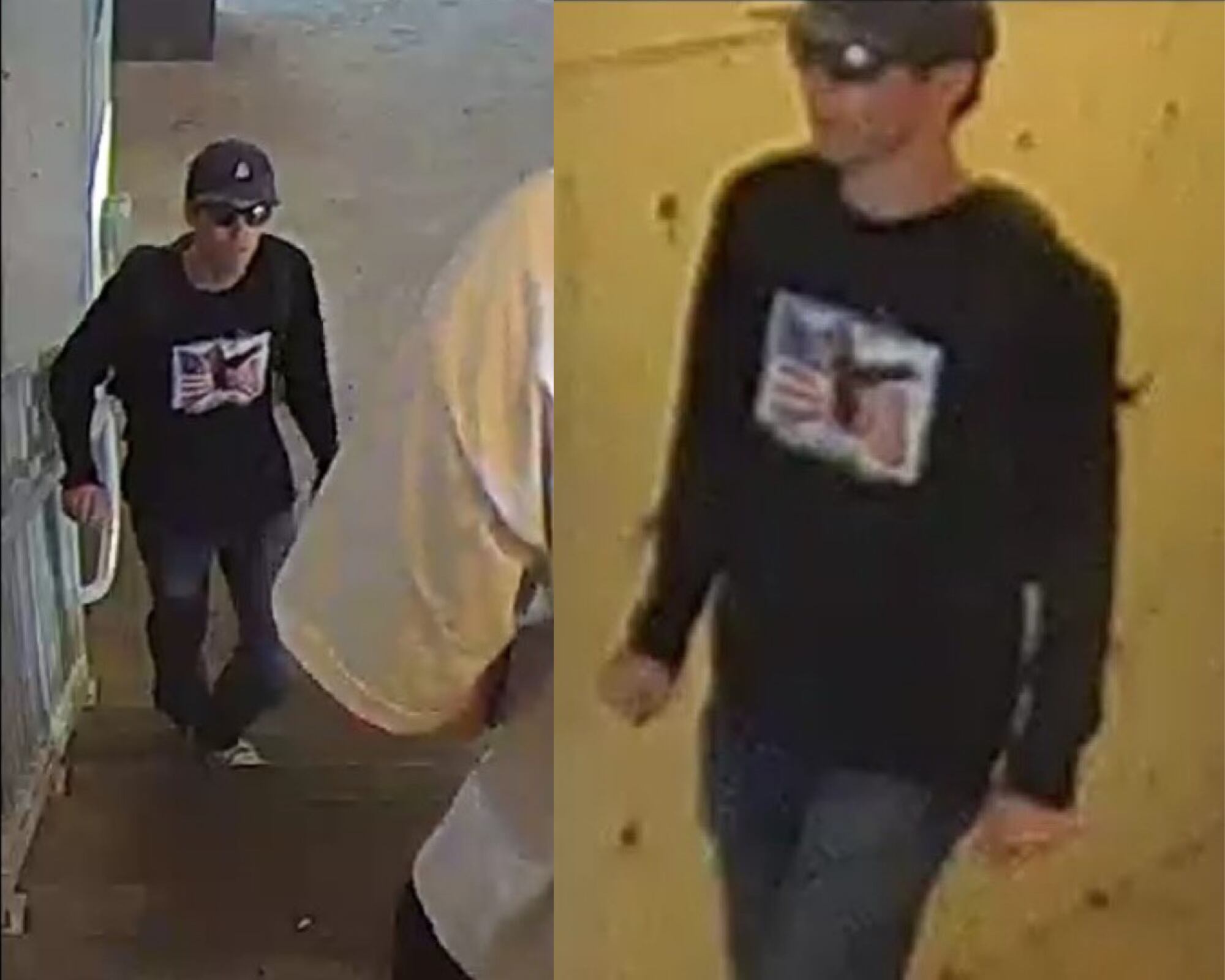 Imágenes compartidas por el FBI en las que se ve un hombre blanco que viste pantalones, sudadera y gorra oscuras y que usa gafas de sol. (Foto: FBI)