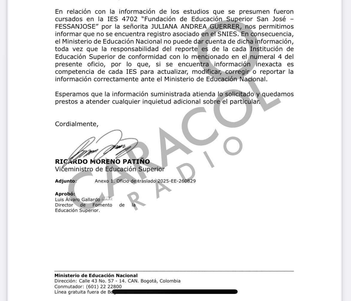 En el Radar de Villar de La Luciérnaga de Caracol Radio se reveló en primicia un derecho de petición que respondió el Ministerio de Educación, en el que se evidencia que no existe registro de la información sobre los estudios universitarios en la Fundación San José sobre Juliana Guerrero, aspirante a viceministra de las juventudes.