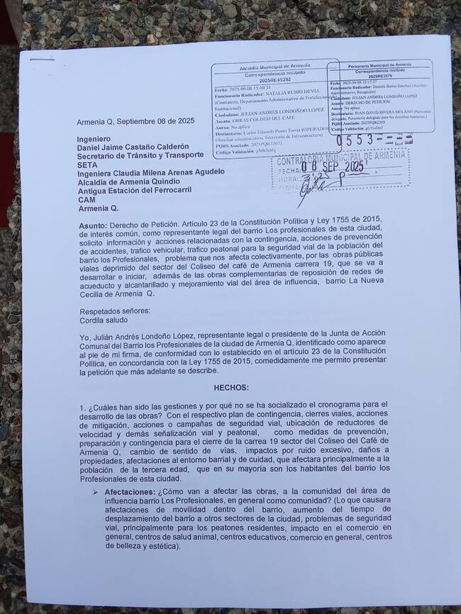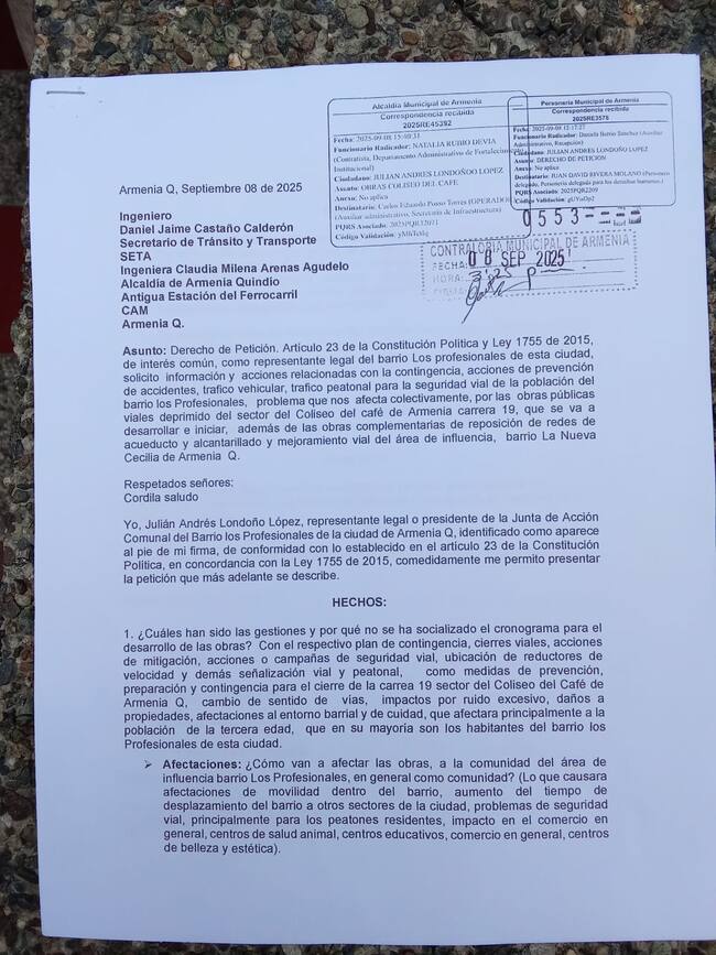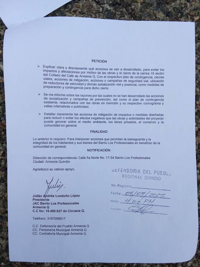 Residentes del sector del coliseo del Café de Armenia radicaron derecho de petición frente a las obras y evidenciaron su malestar por la falta de información