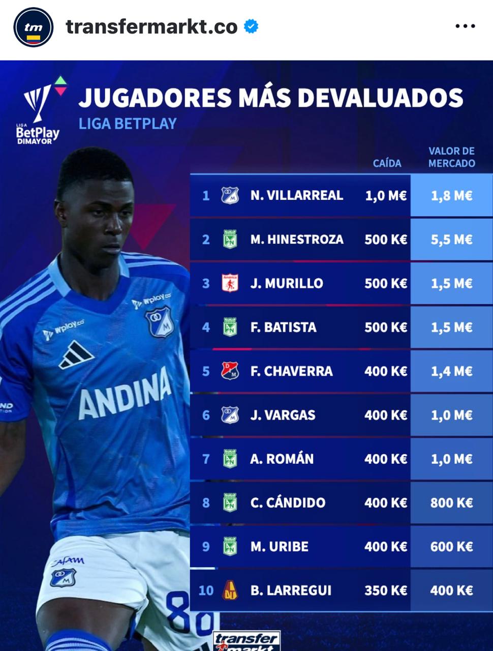 Transfermarkt, portal especializado en el mercado de pases, dio a conocer un listado con el valor en el mercado de los jugadores de los distintos equipos del fútbol colombiano. La misma página web publicó un Top 10 con los futbolistas del FPC que más se han devaluado.