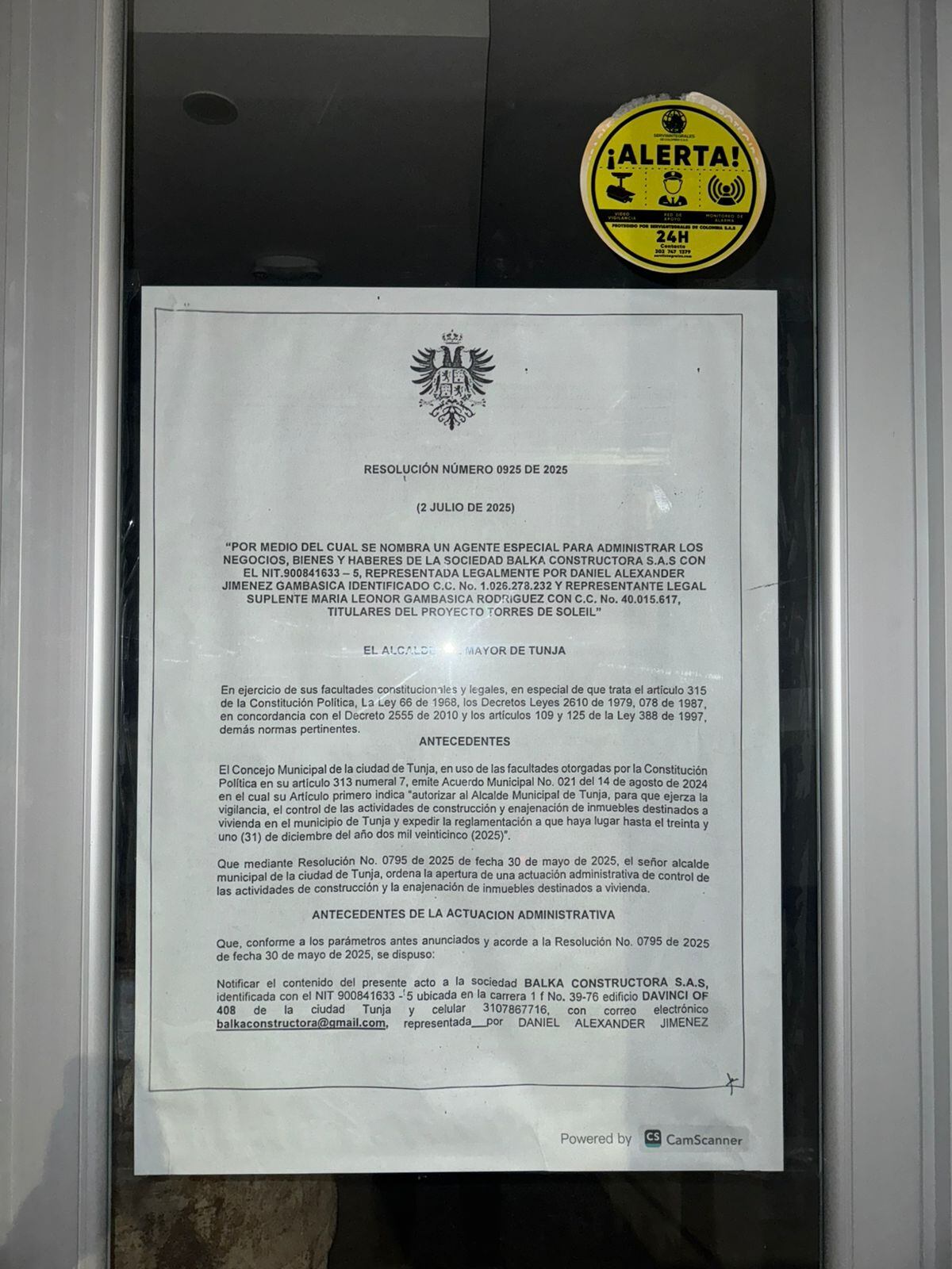 Después del intento de liquidación por parte de la Superintendencia de Sociedades de liquidar la empresa Balka Constructora S.A.S., propiedad de Daniel Alexander Jiménez Gambasica y familia, la alcaldía asumió la toma de posesión del edificio en disputa, con el fin de proteger a los ciudadanos afectados que compraron desde el año 2015 al 2022. Jaime Galvis, representante legal de la empresa J.M. Asociados y agente especial designado, explicó que la Superintendencia de Sociedades cedió la competencia al municipio, en aplicación de la normativa vigente y fallos del Concejo de Estado, más el trabajo adelantado por el Concejo de Tunja, que le otorgaron a la Alcaldía de Tunja las facultades especiales para poder intervenir en casos de proyectos de vivienda que tengan problemas de administración y que afecten a la ciudadanía. Desde junio del presente año, el proceso es administrado directamente por la Alcaldía de Tunja, a través de J.M. Asociados.
