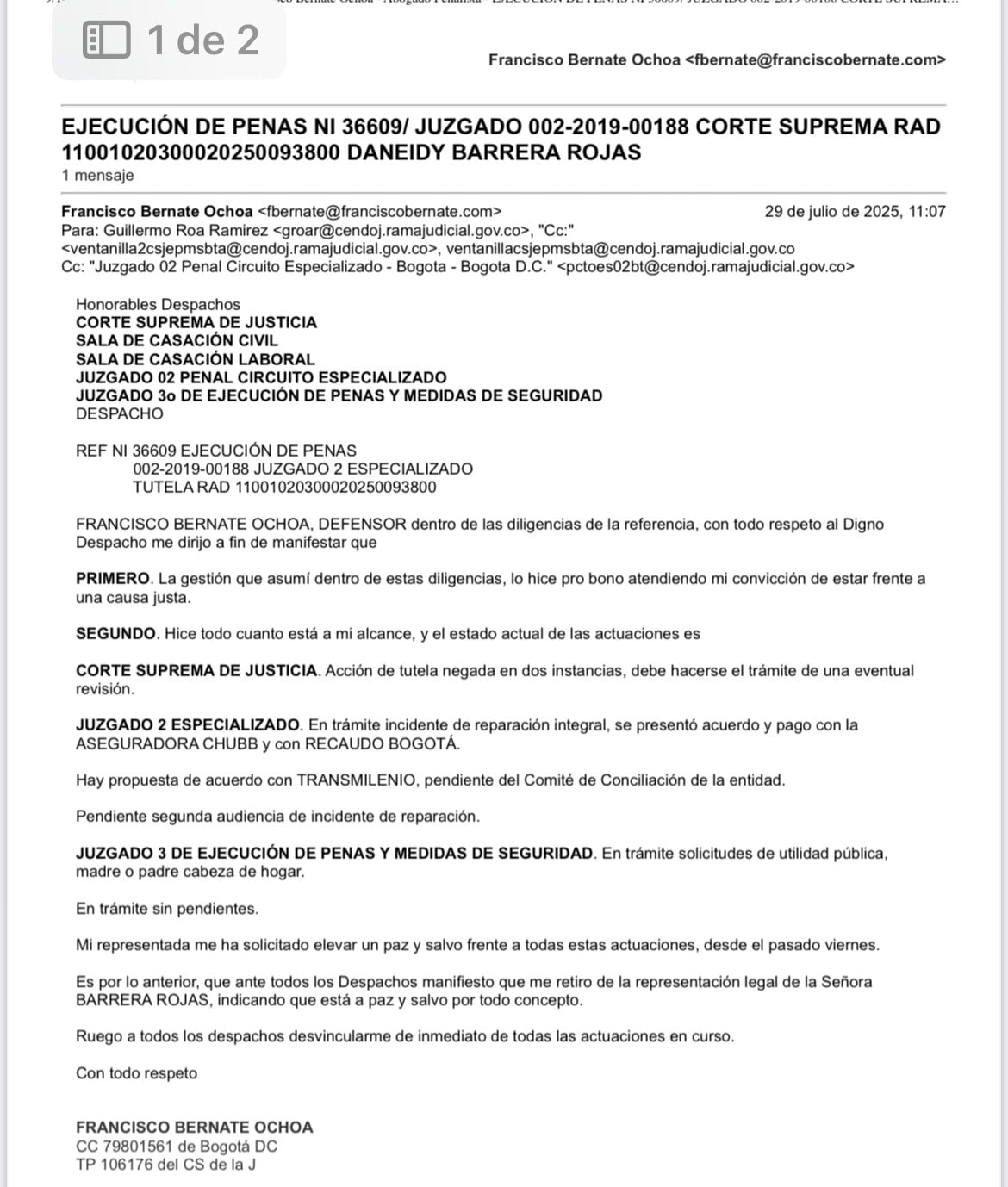 Bernate Ochoa le confirmó a Caracol Radio que decidió dar un paso al costado desde el pasado 15 de julio, luego de que se concretara el traslado de Barrera Rojas desde la cárcel de mujeres El Buen Pastor, en Bogotá, a la escuela de Carabineros de la Policía.