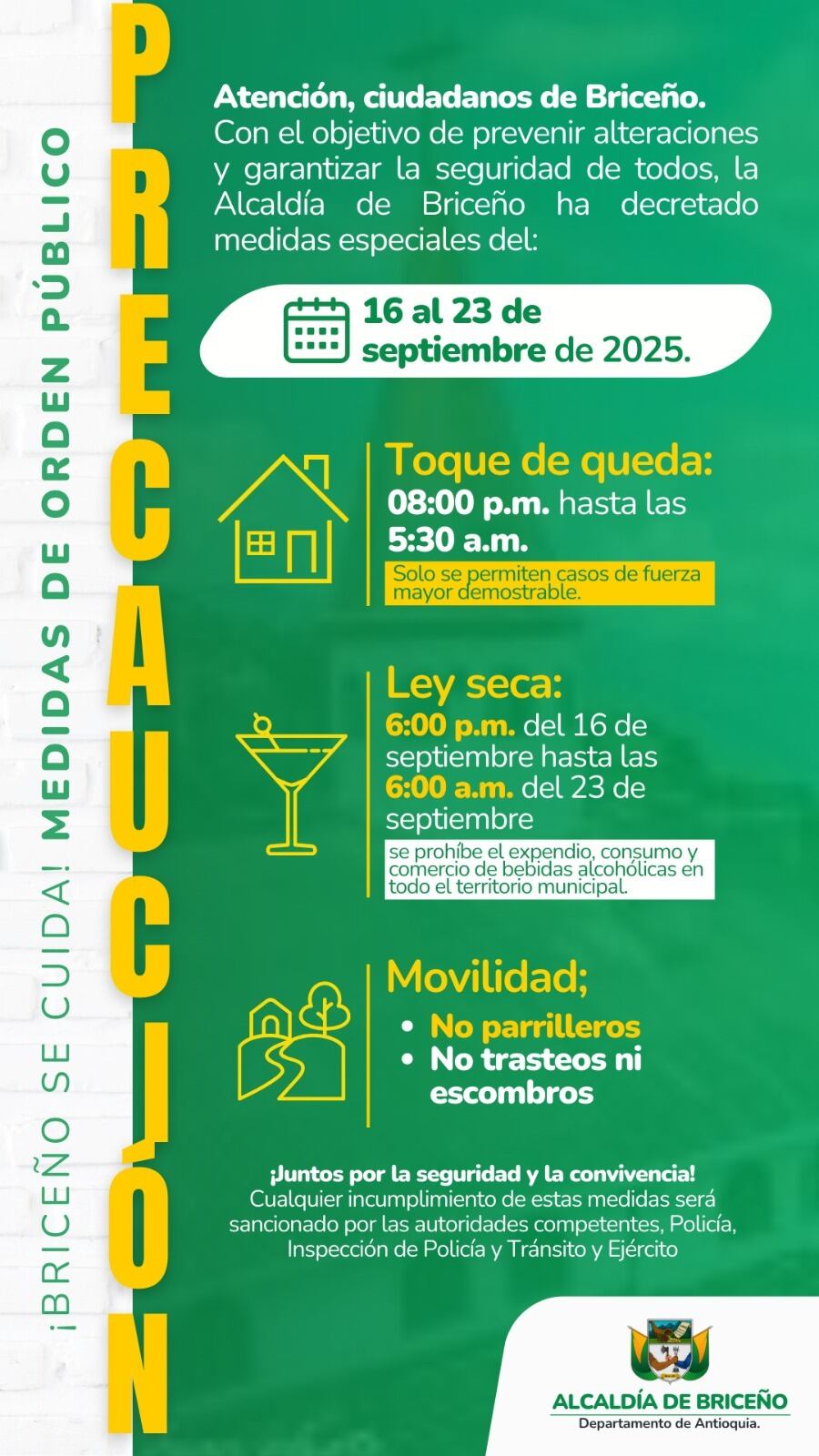 La otra medida es la ley seca en todo el territorio municipal entre las 6:00 p.m. del 16 de septiembre y las 6:00 a.m. del 23 de septiembre de 2025. También se prohíbe el parrillero hombre en la zona urbana entre las 6:00 p.m. y las 6:00 a.m.