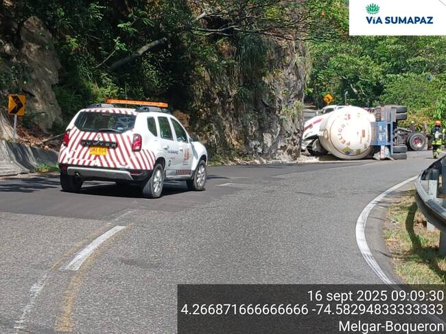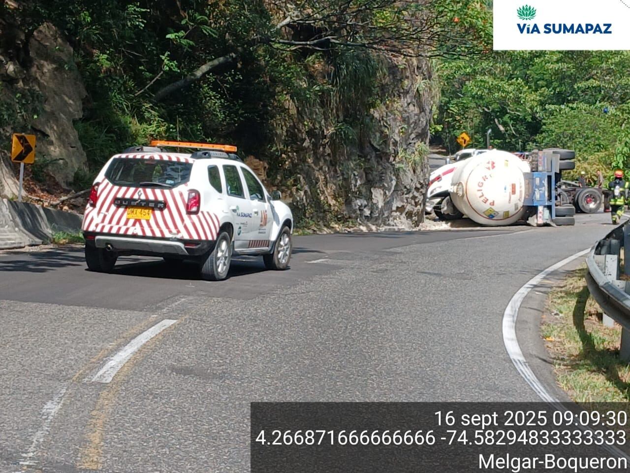 El volcamiento de un vehículo cisterna que transportaba gas licuado de petróleo (GLP) en el kilómetro 37, sector conocido como la Nariz del Diablo, obligó al cierre de la vía Bogotá–Girardot y al manejo de pasos intermitentes por el túnel Sumapaz.