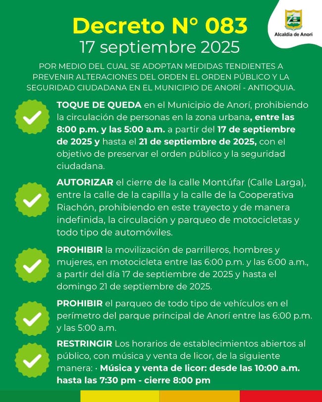 Ante esta situación, la alcaldía decidió tomar acciones de seguridad para garantizar la seguridad de los civiles: “Toque de queda en el Municipio de Anorí, prohibiendo la circulación de personas en la zona urbana, entre las 8:00 p.m. y las 5:00 a.m. a partir del 17 de septiembre de 2025 y hasta el 21 de septiembre de 2025, con el objetivo de preservar el orden público y la seguridad ciudadana”, dice el decreto No. 083 (17 de septiembre de 2025).