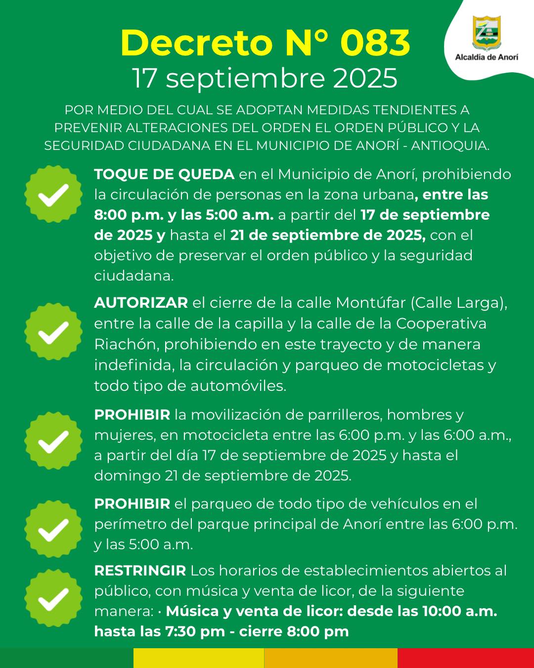 Ante esta situación, la alcaldía decidió tomar acciones de seguridad para garantizar la seguridad de los civiles: “Toque de queda en el Municipio de Anorí, prohibiendo la circulación de personas en la zona urbana, entre las 8:00 p.m. y las 5:00 a.m. a partir del 17 de septiembre de 2025 y hasta el 21 de septiembre de 2025, con el objetivo de preservar el orden público y la seguridad ciudadana”, dice el decreto No. 083 (17 de septiembre de 2025).