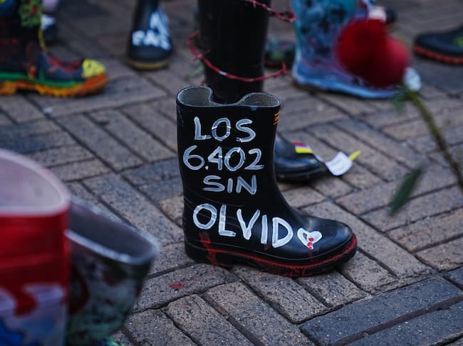 Las botas representan a las 6.402 víctimas documentadas por la Jurisdicción Especial para la Paz (JEP). Liderada por MAFAPO (Madres de Falsos Positivos), la protesta instó a preservar las botas como homenaje a la memoria de las víctimas. (Foto de Juancho Torres/Anadolu vía Getty Images) / Anadolu