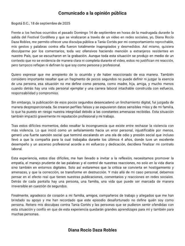 Comunicado Diana Rocio Daza. Cortesía: Redes Sociales.