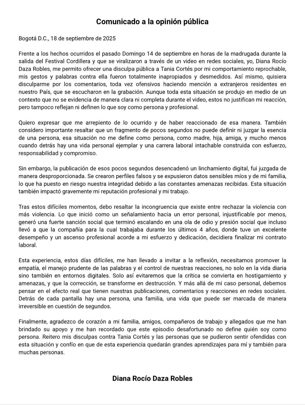 Comunicado Diana Rocio Daza. Cortesía: Redes Sociales.