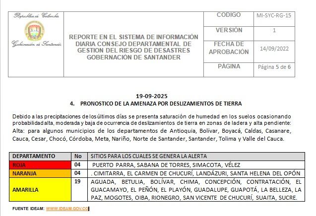 En el departamento de Santander, en las últimas horas se han registrado fuertes lluvias, por lo que los municipios de Puerto Parra, Sabana de Torres, Simacota y Vélez están en alerta roja por deslizamientos de tierra.