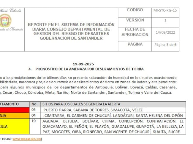 Santander: 4 municipios en alerta por deslizamientos debido a fuertes lluvias