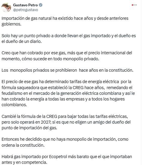 Mensaje de Gustavo Petro sobre importación de gas. Cortesía: Redes Sociales.