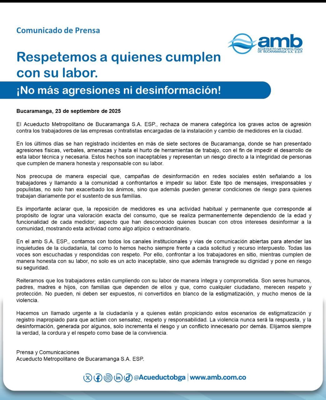 El Acueducto Metropolitano de Bucaramanga (AMB) rechazó las agresiones verbales y físicas que han sufrido trabajadores de la empresa contratista encargada de la instalación y reposición de medidores en varios sectores de la ciudad.