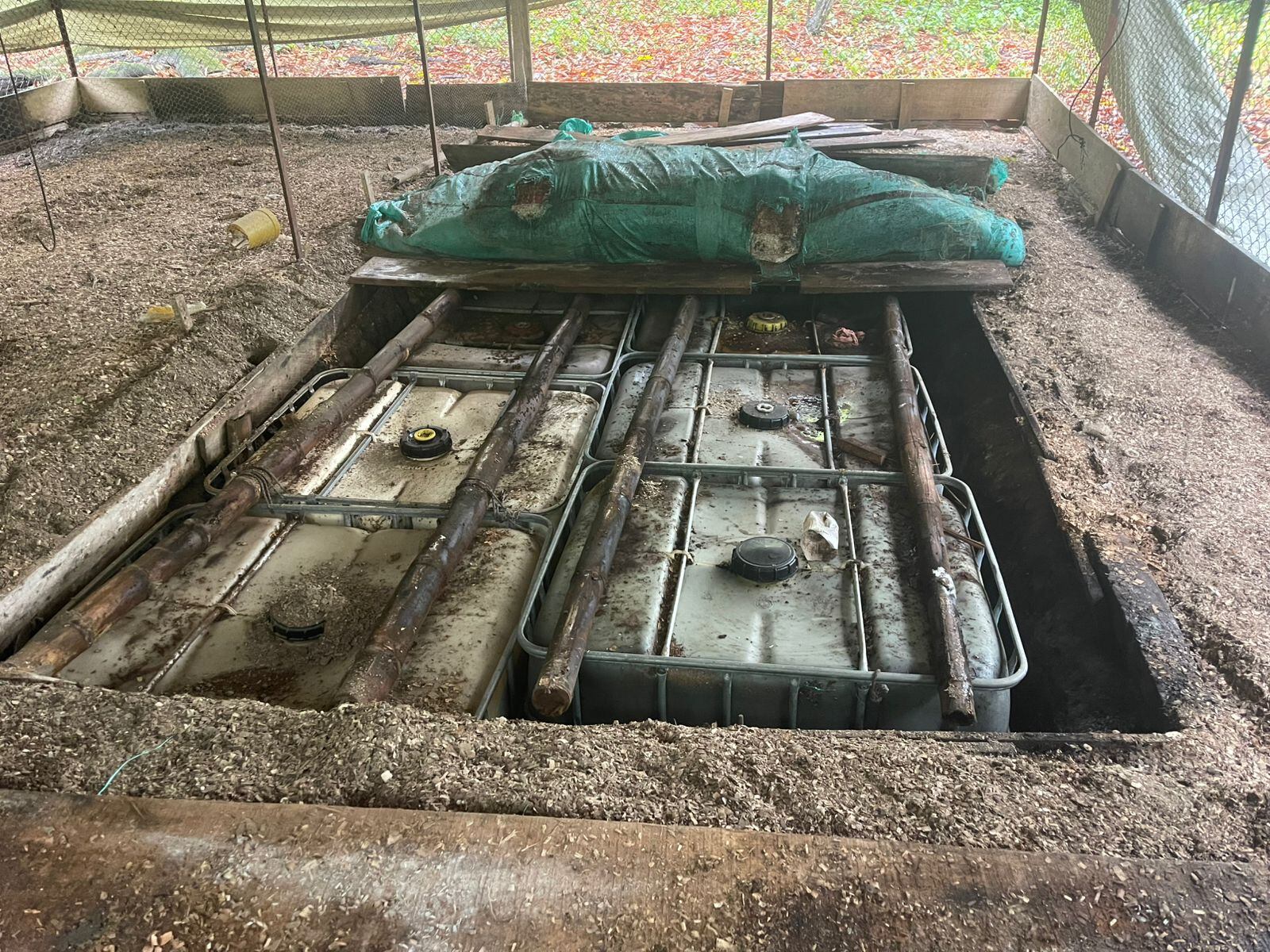 El combustible permanecía almacenado en seis contenedores plásticos con soporte metálico, con la capacidad de 250 galones cada uno; además, se encontró motobomba, mangueras con diferentes acoples, abrazaderas y válvula de alta presión.