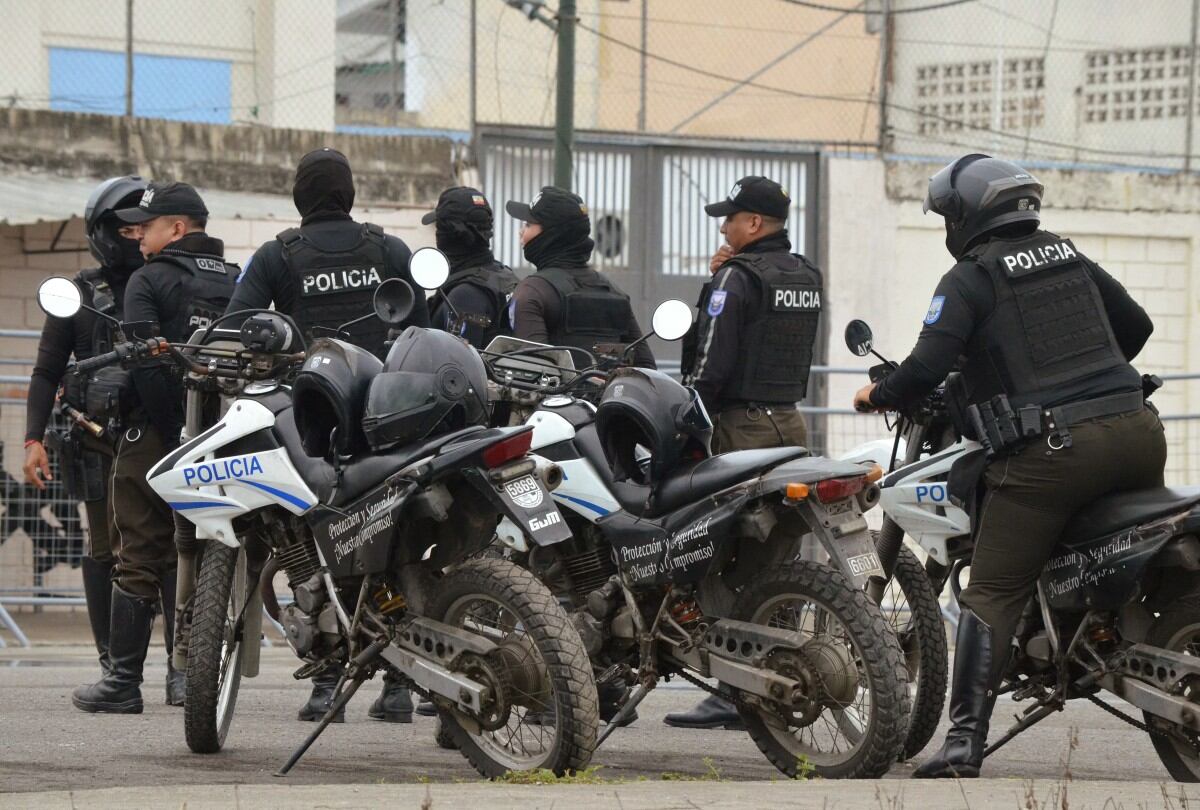 Police officers stand guard outside the main prison in Machala, Ecuador on September 22, 2025. Thirteen inmates and a prison guard were killed in clashes on September 22, 2025, between rival gangs armed to the teeth in a prison in southwest Ecuador, police in the violence-wracked South American country said. (Photo by Ariel Su�rez / AFP) / ARIEL SUAREZ