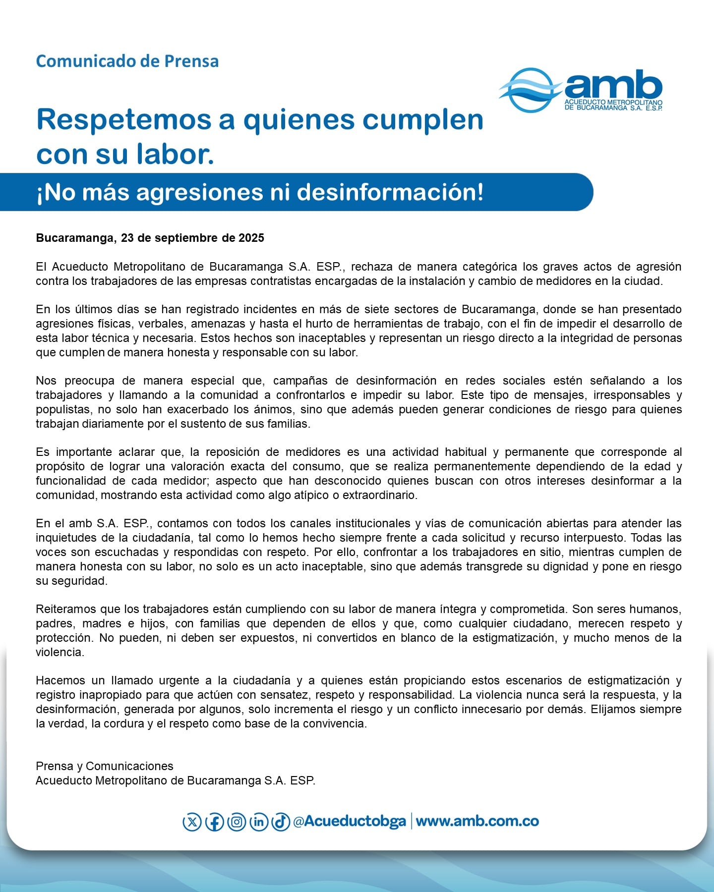 El Acueducto Metropolitano de Bucaramanga (amb) denunció agresiones contra trabajadores