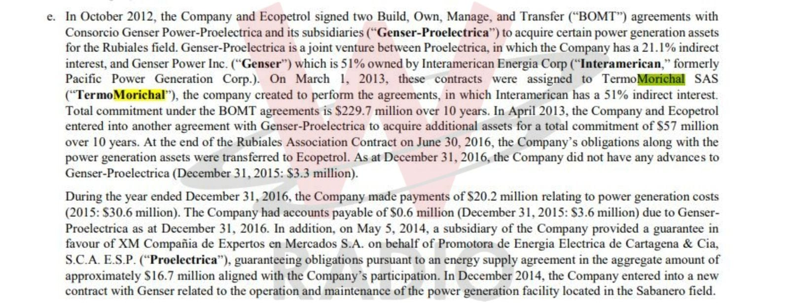 A eso se suma el segundo detalle, nada menor, que queda en evidencia en el informe a los accionistas de Pacific y es que esa empresa, Pacific Rubiales, era accionista de la empresa configurada para construir, operar y transferir a Ecopetrol las plantas de Termomorichal.