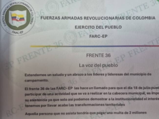 Comunicado del frente 36 citando a una reunión a la comunidad en Campamento.