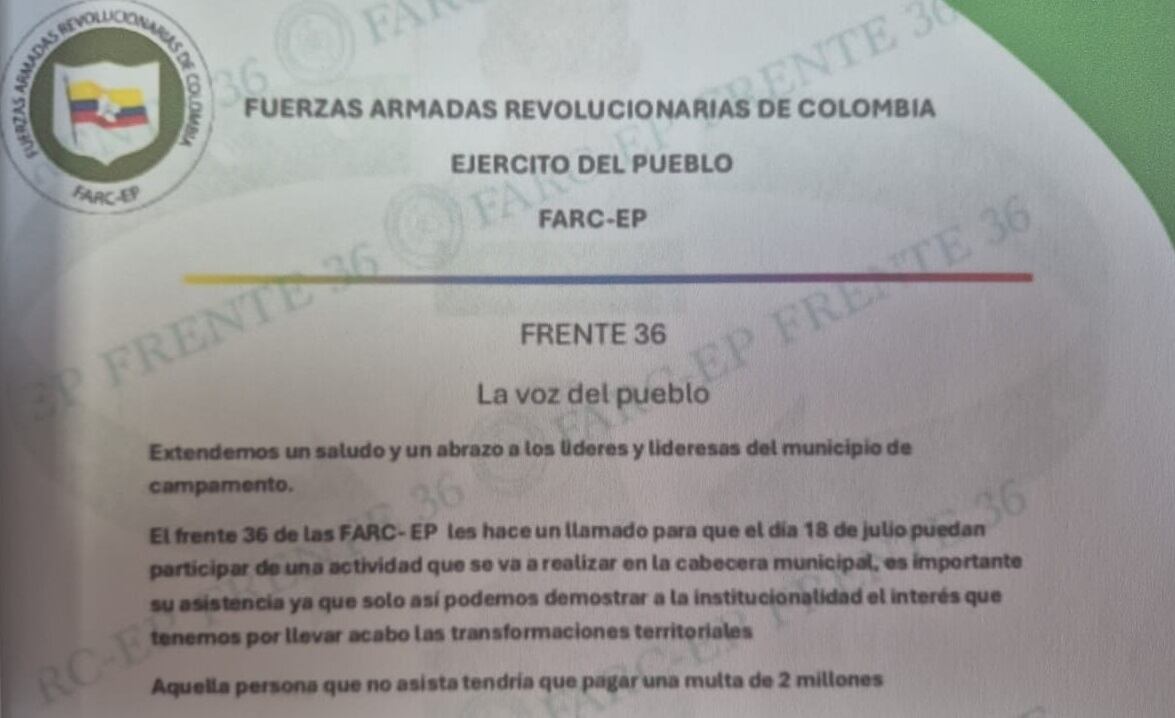 Comunicado del frente 36 citando a una reunión a la comunidad en Campamento.