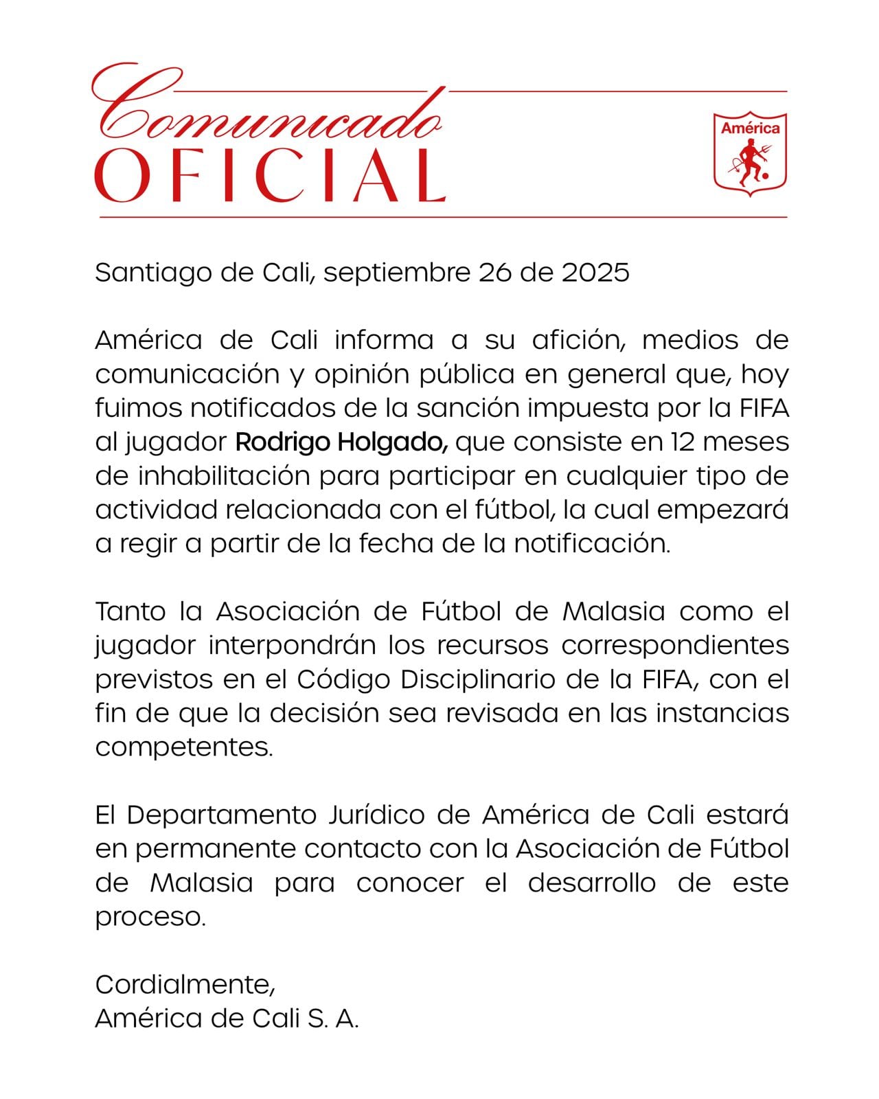 El conjunto Escarlata emitió un comunicado de prensa en el que informó que fueron notificados de la sanción a su delantero por el periodo de 12 meses. Eso sí, aseguran que tanto la Federación de Malasia, como el jugador, impondrán los requerimientos necesarios para que la decisión sea revisada.