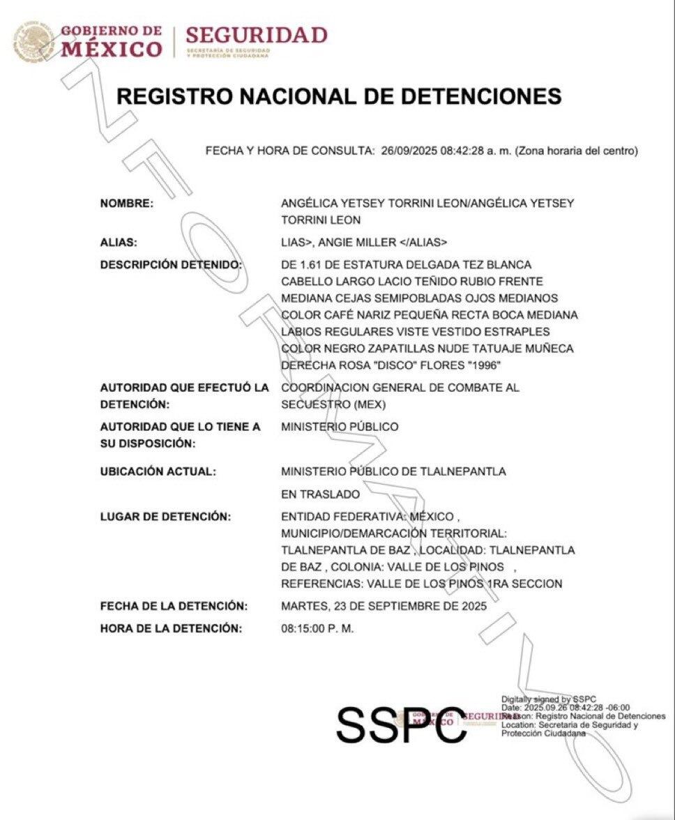 Sin embargo, el Registro Nacional de Detenciones confirmó hoy que Angélica Yetsey Torrini León fue arrestada en Tlalnepantla, Estado de México, esa misma noche.
