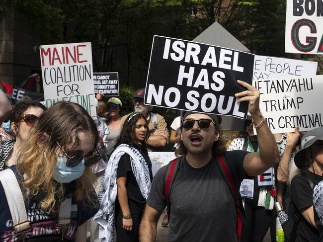 Los manifestantes ondean banderas palestinas y levantan más carteles con la cara de Netanyahu y consignas propalestinas, en una manifestación que no ha congregado a tantos asistentes como otras del mismo objetivo celebrado en Nueva York durante el último año.