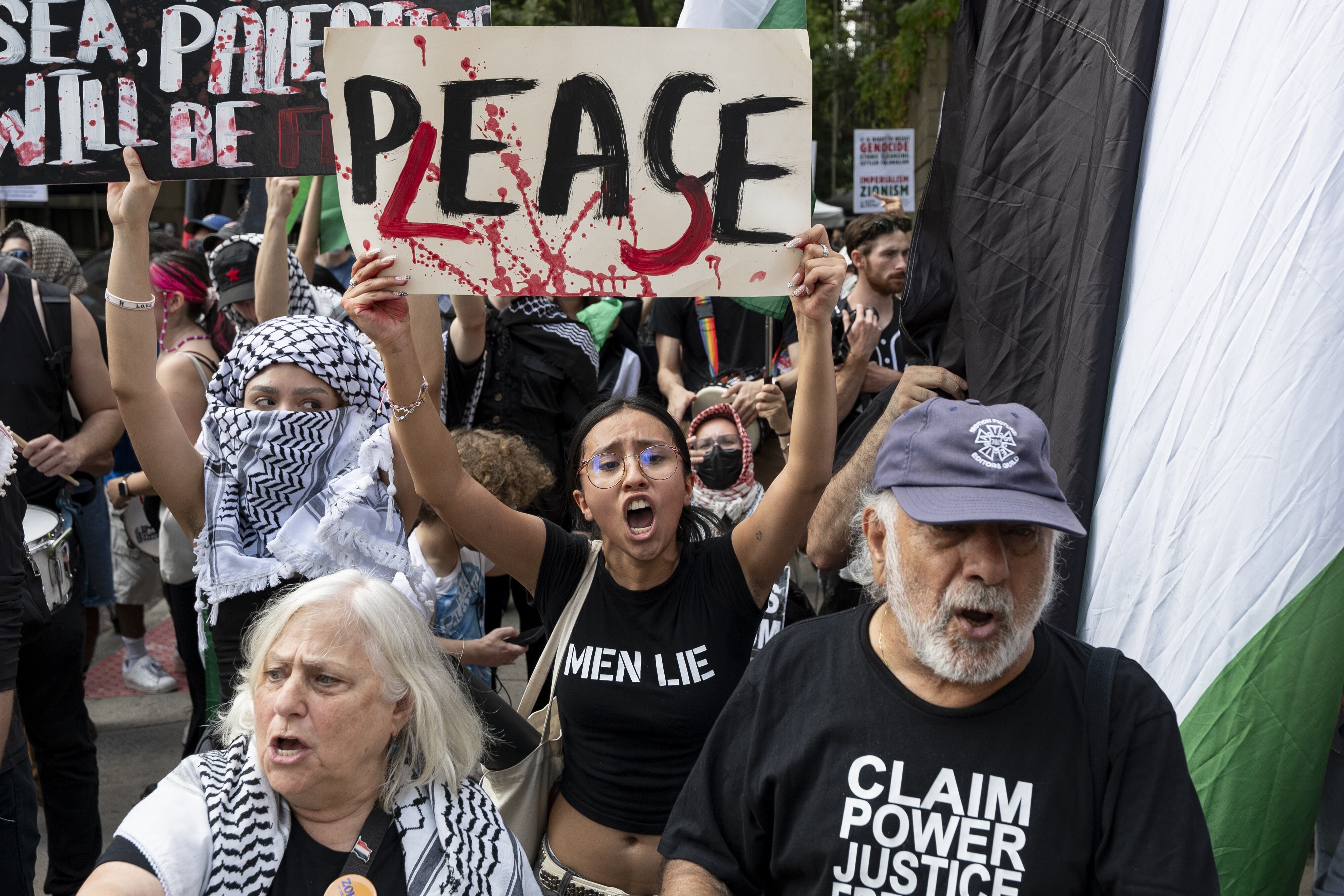 Los manifestantes ondean banderas palestinas y levantan más carteles con la cara de Netanyahu y consignas propalestinas, en una manifestación que no ha congregado a tantos asistentes como otras del mismo objetivo celebrado en Nueva York durante el último año.