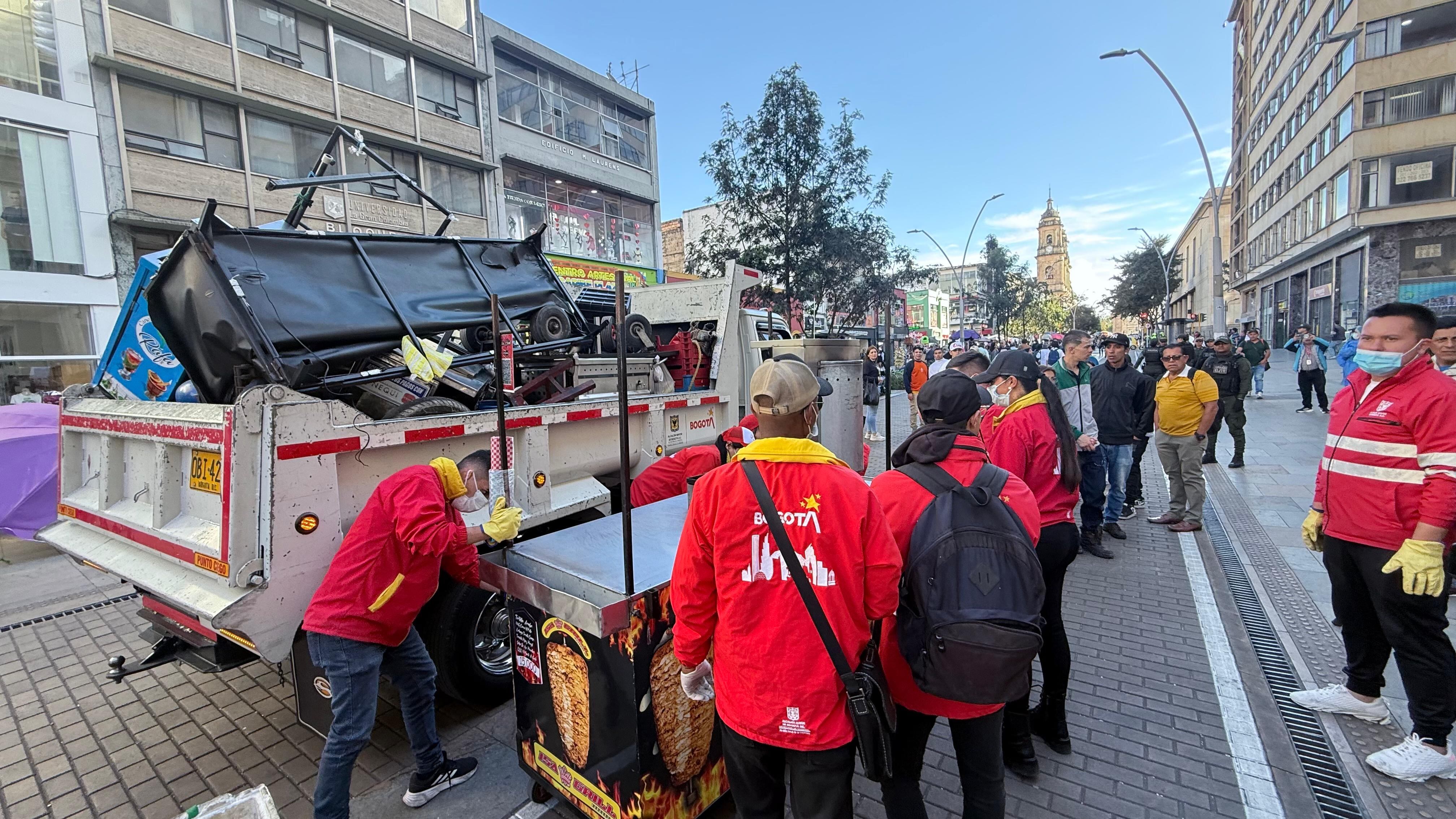 “En el marco de la operación de espacio público nos encontramos en la carrera séptima. Tenemos cuatro capturados en flagrancia, siete vehículos de ventas informales incautados por condiciones insalubres, un comparendo impuesto en el marco de la Ley 1801 y un balance de una persona lesionada de alcaldía local y daños contra bienes públicos”.