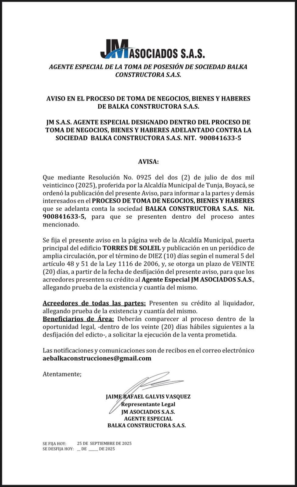 Se espera que en diciembre de 2025 inicie la entrega de escrituras a quienes cumplan los requisitos y pagos pendientes, lo que beneficiaría a más de 15 familias. Asimismo, se convocó a los acreedores de Balka Constructora S.A.S. a presentar sus créditos ante J.M. Asociados dentro de los 20 días hábiles siguientes a la desfijación del edicto, en cumplimiento de los artículos 48 y 51 de la Ley 1116 de 2006.