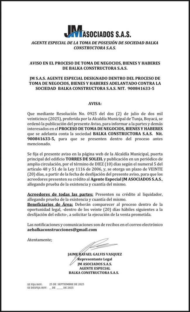 La Alcaldía de Tunja, a través de J.M. Asociados, tomó posesión del edificio Torres de Soleil para garantizar los derechos de más de 15 familias afectadas por la constructora Balka S.A.S., y anunció que en diciembre iniciaría la entrega de escrituras a quienes cumplan los requisitos.