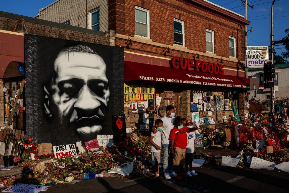 Un padre le toma a su hijo una foto en frente del memorial a George Floyd, en Minneapolis.