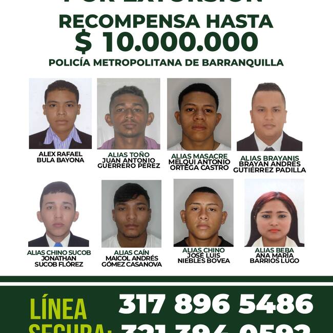 Como parte de la estrategia, la Alcaldía de Barranquilla y la Policía Metropolitana anunciaron que se ofrecen recompensas de hasta 10 millones de pesos a quienes entreguen información que permita dar con la captura de los señalados en el cartel, buscando incentivar la denuncia ciudadana y acelerar los resultados en la lucha contra la extorsión.