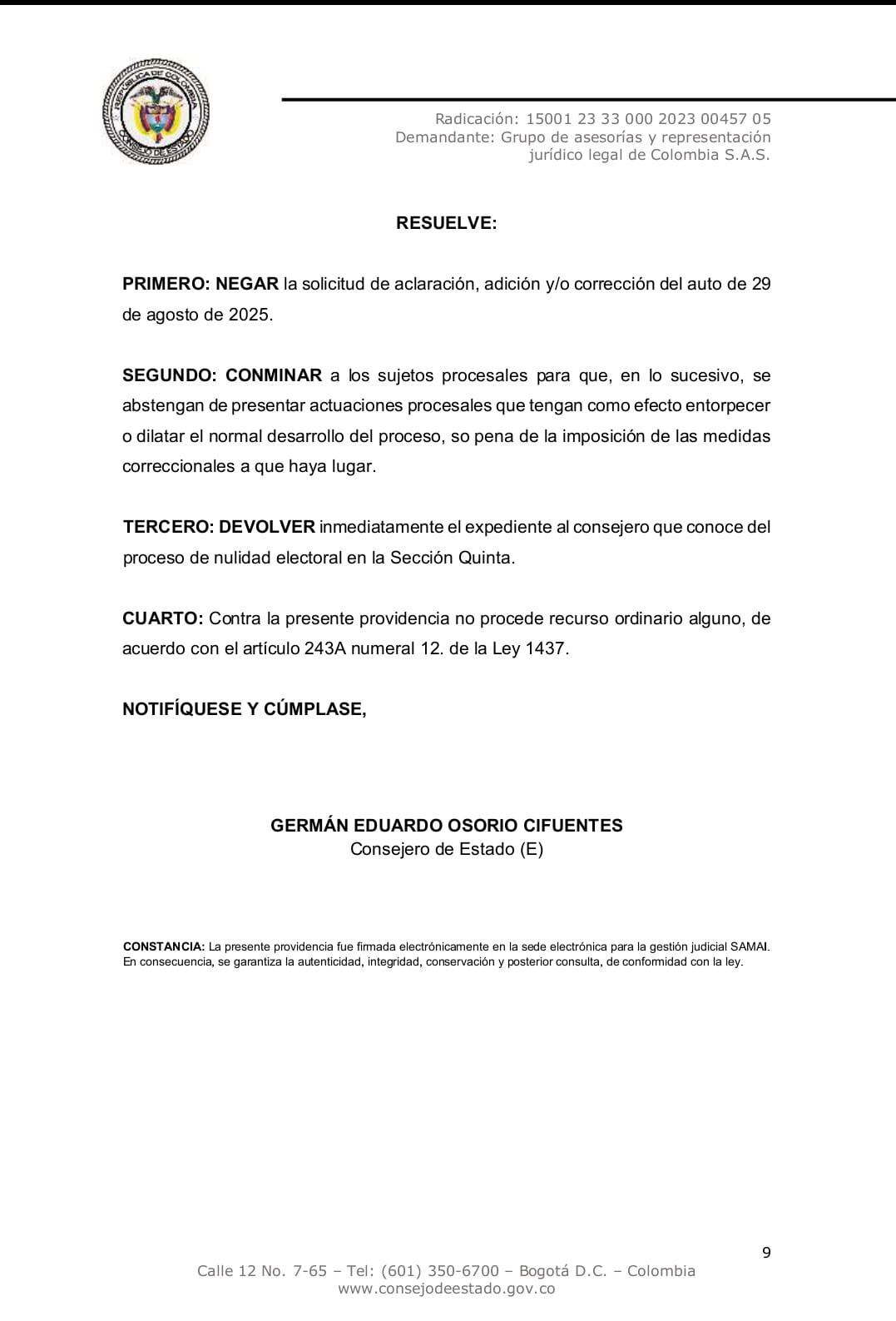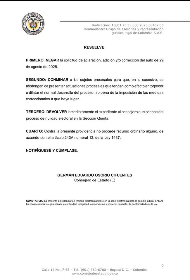 La alta corte conminó a las partes a abstenerse de presentar actuaciones que tengan como efecto entorpecer o dilatar el trámite judicial, advirtiendo que de persistir podrán imponerse medidas correccionales. Asimismo, ordenó devolver el expediente al consejero de la Sección Quinta que conoce del caso, para que continúe el estudio de fondo sobre la validez de la elección del actual alcalde de Tunja. Contra esta decisión no procede recurso ordinario alguno.
