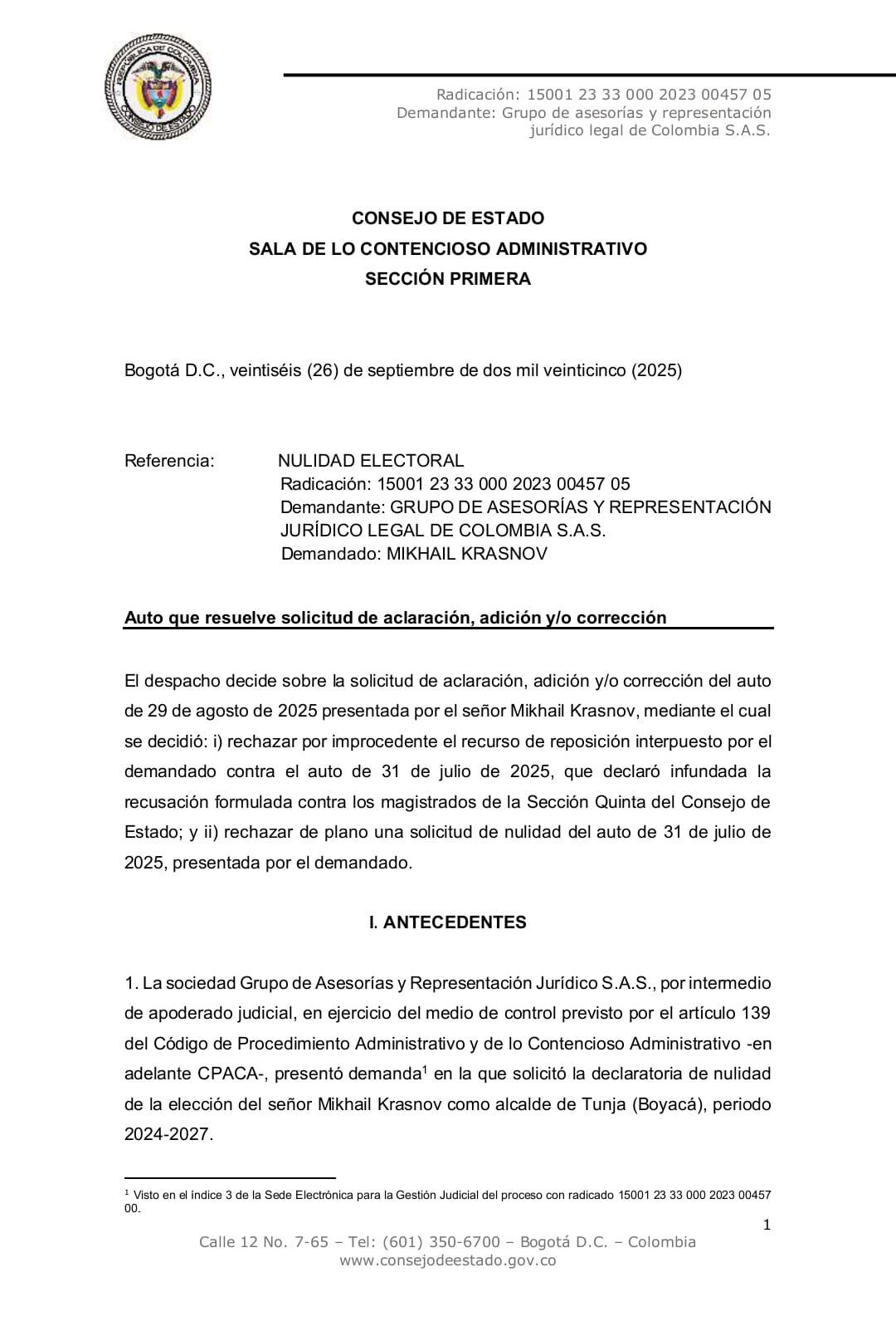 El Consejo de Estado, a través de la Sala de lo Contencioso Administrativo, Sección Primera, negó la solicitud de aclaración, adición y/o corrección presentada por el alcalde de Tunja, Mikhail Krasnov, contra el auto del 29 de agosto de 2025. La corporación concluyó que el escrito presentado no señalaba conceptos o frases de la parte resolutiva que generaran dudas, ni tampoco errores aritméticos o de palabras, como exige la ley para este tipo de peticiones. En consecuencia, determinó que los argumentos de Krasnov constituían una reiteración de asuntos ya resueltos previamente.