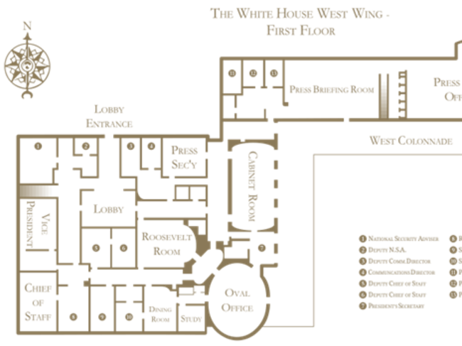 El siguiente es el mapa oficial del ala oeste que marca con el número uno el espacio de trabajo del asesor de Seguridad Nacional. Por la proximidad al presidente se puede evaluar la importancia de esta dependencia.