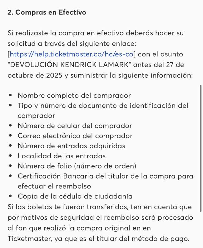 Si se realizó la compra en efectivo se deberá hacer la solicitud a través del enlace https://help.ticketmaster.co/hc/es-co con el asunto: “Devolución Kendrick Lamar” antes del 27 de octubre de 2025 y suministrar la siguiente información: