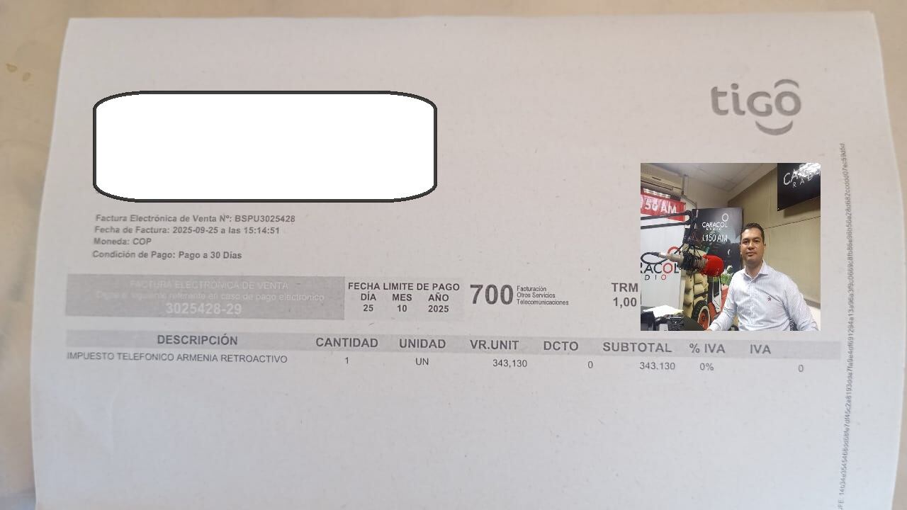 Así está llegando la factura de TIGO en Armenia con cobro de impuesto de telefonía fija. Foto: Cortesía ciudadanos/ Caracol Radio