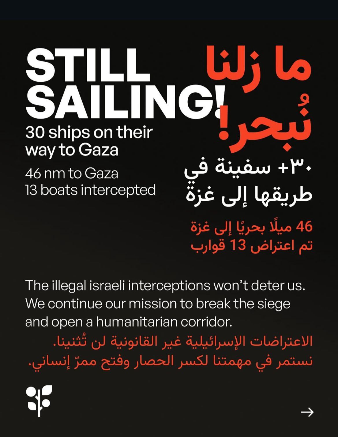“Seguimos navegando”, reza una publicación en la página de Instagram de la organización, que fecha esta última actualización a las 00:20 GMT. “Las intercepciones ilegales de Israel no nos disuadirán. Continuamos con nuestra misión para romper el bloqueo y abrir un corredor humanitario”, agrega.