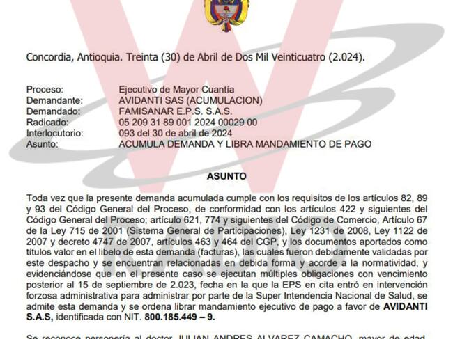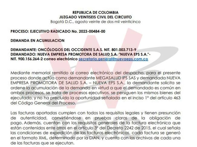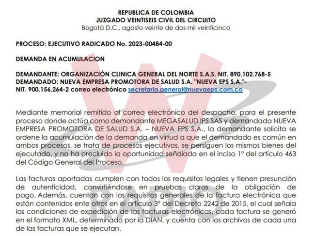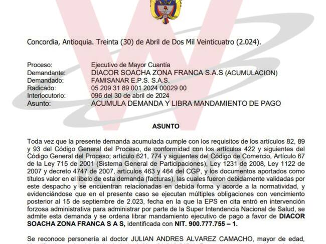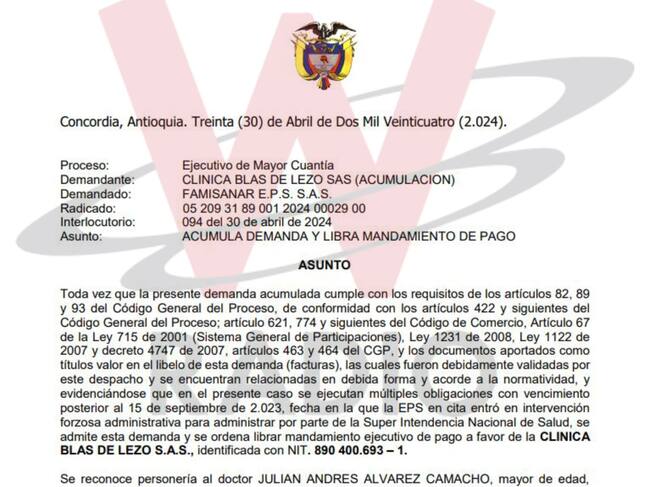 De hecho, La W conoció que al menos 5 IPS del grupo Zentria - uno de los protagonistas del Laberinto de los dineros de la salud, mejor recordado como Grupo Patria o Venum Investment - demandaron ante ese juez a Famisanar por más de 30.000 millones de pesos con el fin de garantizar el pago de los recursos adeudados.