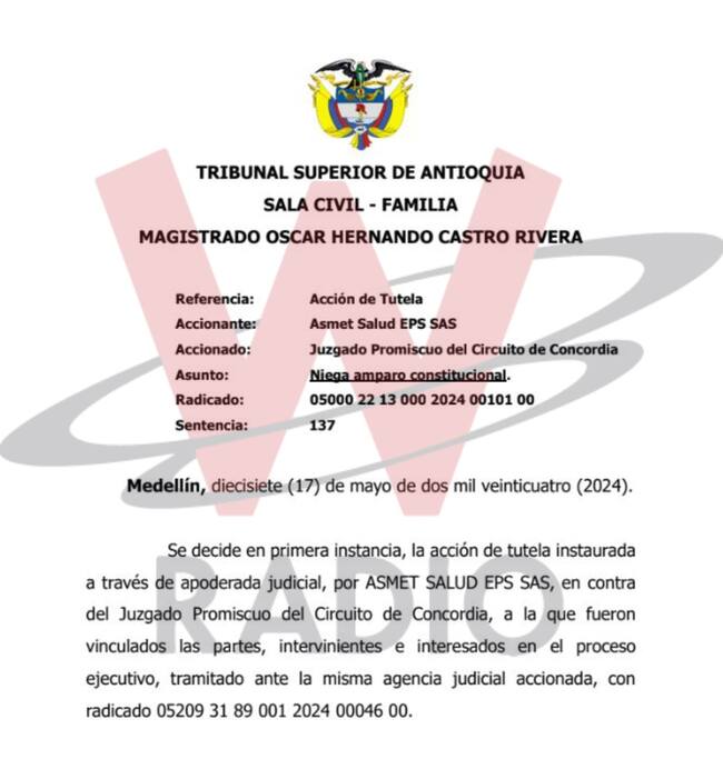 Hecho que se deriva de la decisión del tribunal de Antioquia y luego de la Corte Suprema de Justicia a la mencionada tutela, pues en ambos casos los magistrados señalaron la negligencia de Asmet Salud para proteger los dineros de la salud, pues nunca respondieron a las demanda ejecutivas que se acumulaban en el juzgado promiscuo del municipio de Concordia.