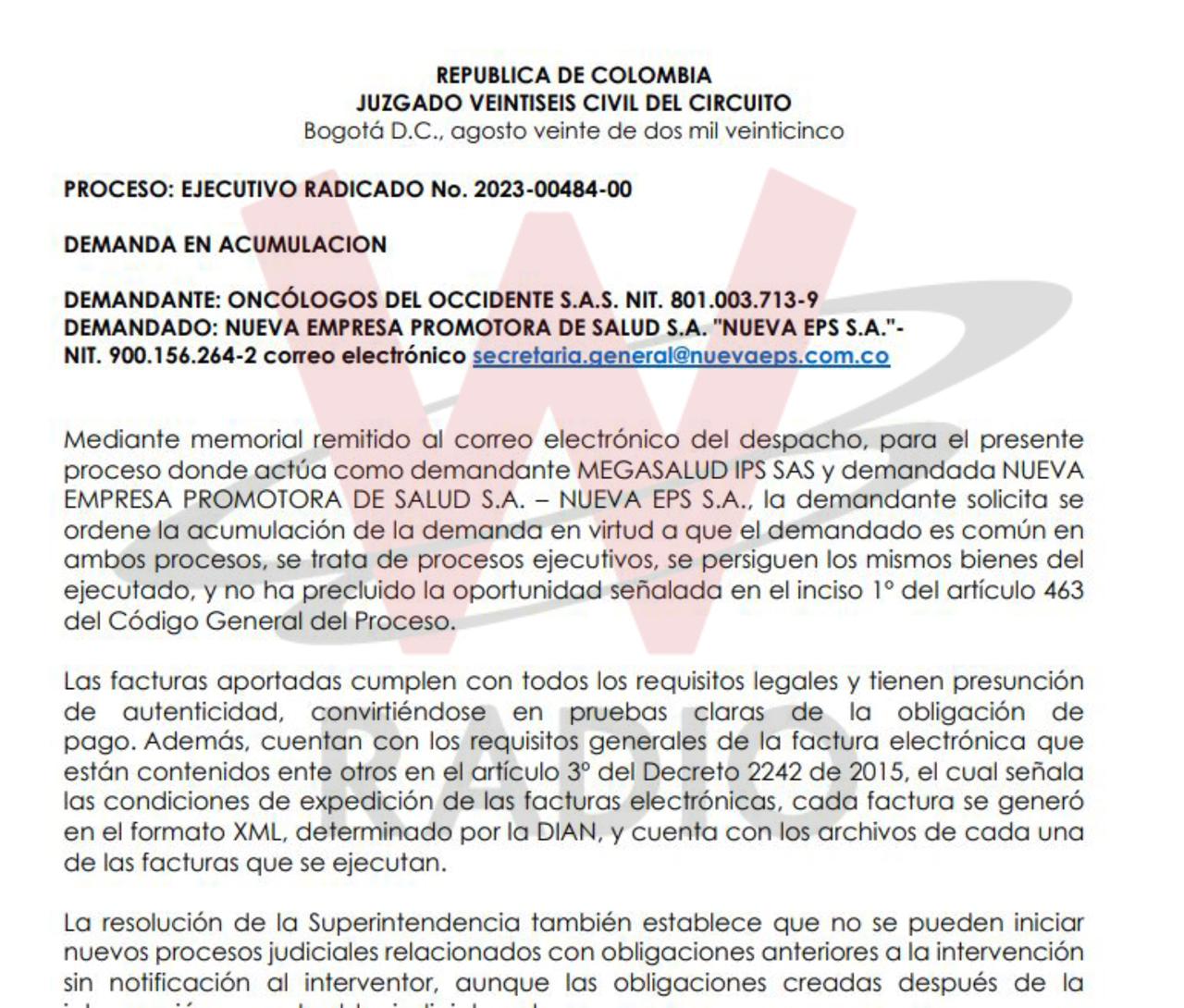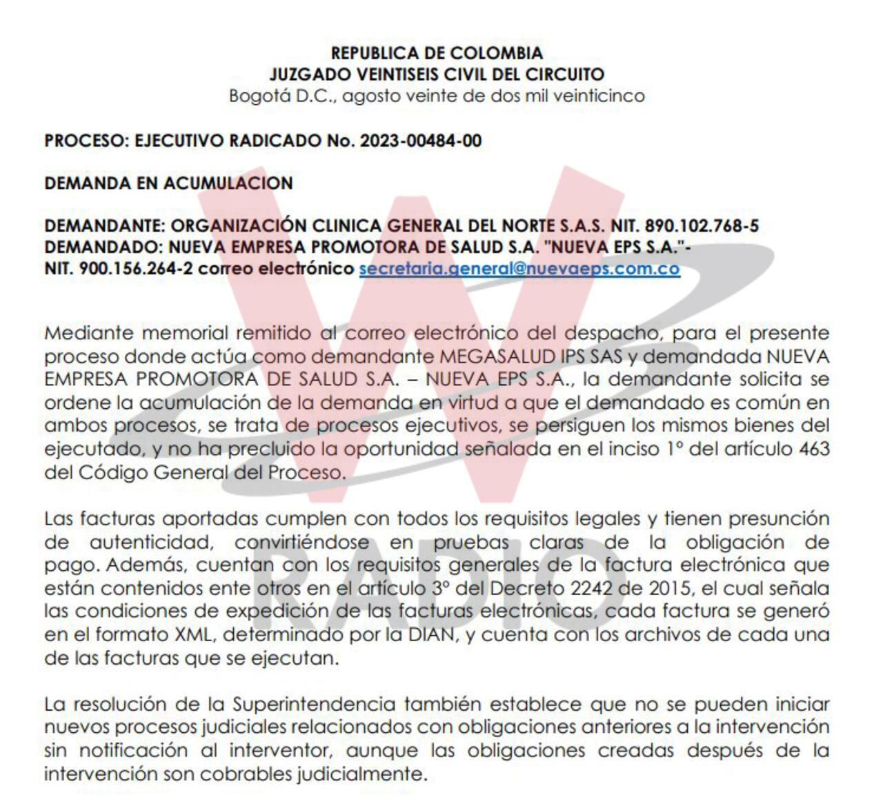 De hecho, La W conoció que al menos 5 IPS del grupo Zentria - uno de los protagonistas del Laberinto de los dineros de la salud, mejor recordado como Grupo Patria o Venum Investment - demandaron ante ese juez a Famisanar por más de 30.000 millones de pesos con el fin de garantizar el pago de los recursos adeudados.