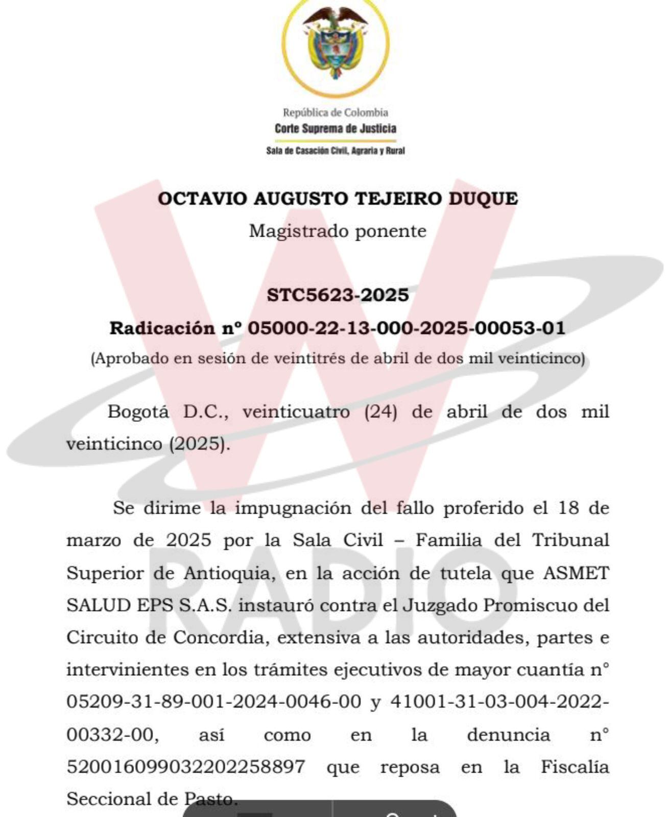 La prueba al respecto es la acción de tutela que Asmet Salud interpuso contra la decisión del juez para supuestamente evitar el embargo de los recursos. Una tutela en la que fueron vinculados desde la Procuraduría General de la Nación hasta la Superintendencia Nacional de Salud como consta en el documento que consta a continuación.