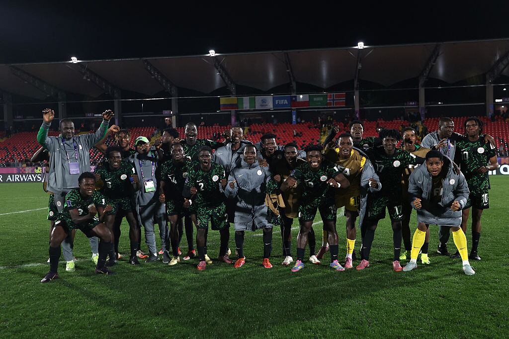 TALCA, CHILE - OCTOBER 02: Players of Nigeria celebrates following the FIFA U-20 World Cup Chile 2025 Group F match between Nigeria and Saudi Arabia at Estadio Fiscal on October 02, 2025 in Talca, Chile. (Photo by Ricardo Moreira - FIFA/FIFA via Getty Images) / Ricardo Moreira - FIFA