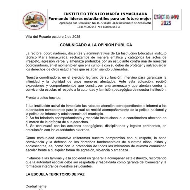 La comunidad educativa del Instituto Técnico María Inmaculada, en Villa del Rosario, se pronunció con firmeza tras los hechos registrados en esa institución, donde una coordinadora fue víctima de expresiones amenazantes mientras cumplía con su deber de proteger los derechos de varios estudiantes.