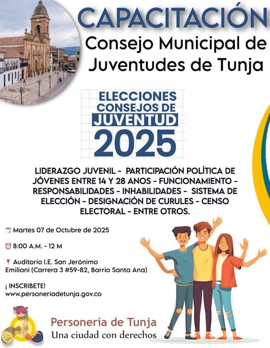 El personero de Tunja, Nelson Andrés Villabona, anunció que este martes se llevará a cabo una capacitación dirigida a jóvenes entre 14 y 28 años sobre las elecciones de los Consejos Municipales de Juventud, que se realizarán el próximo 19 de octubre. «...Estos espacios permiten que los jóvenes elijan a sus representantes, quienes participarán en la formulación de políticas públicas y en la vigilancia de la inversión de recursos destinados a esta población...», explicó en diálogo con Caracol Radio.