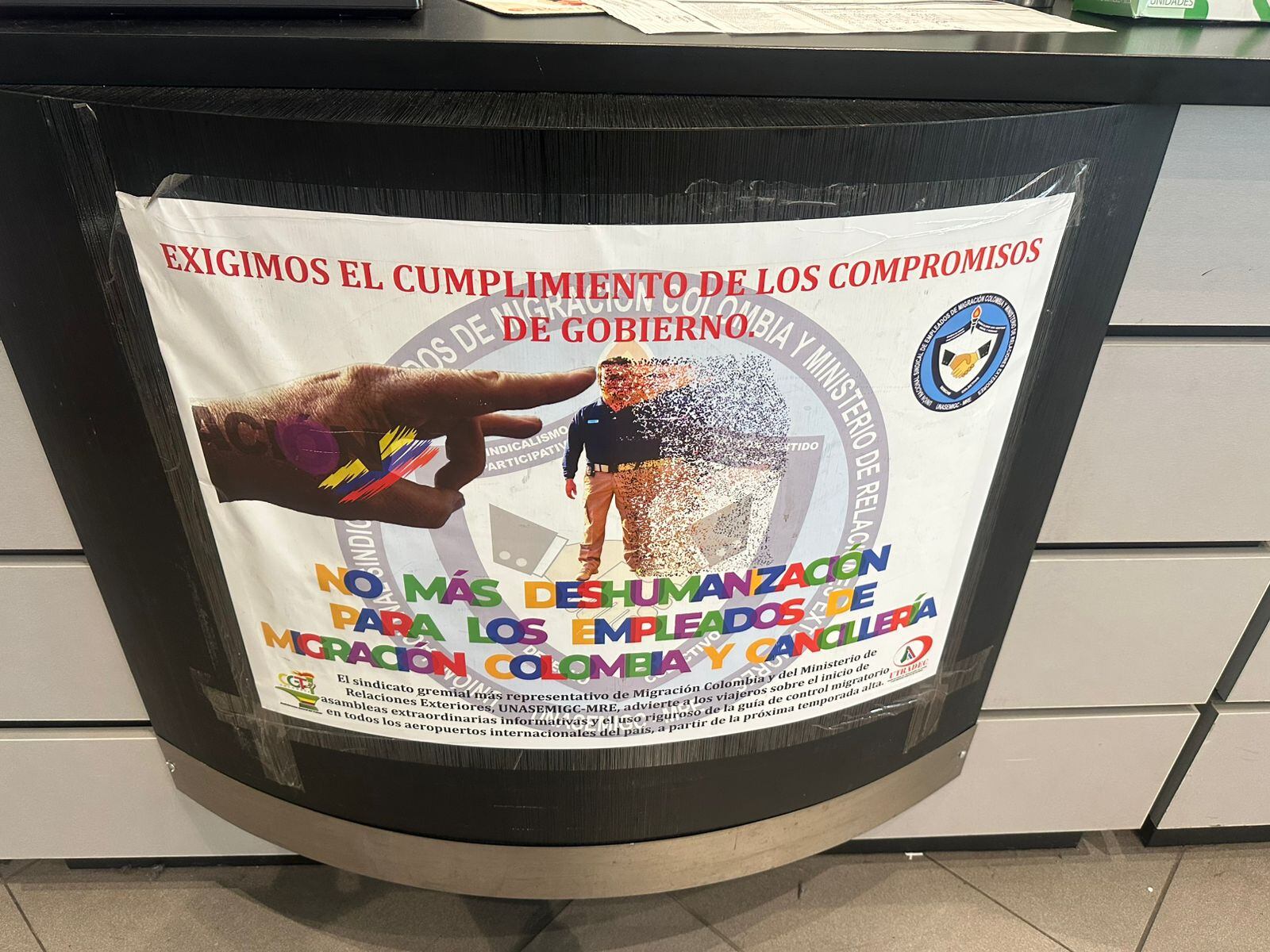 En las ventanillas de Migración, hay letreros del sindicato, en el que le exigen al gobierno el cumplimiento de los compromisos adquiridos tras el plan tortuga que efectuaron el pasado mes de mayo, y señalan puntualmente que “no más deshumanización para los empleados de Migración Colombia y la Cancillería”.