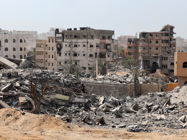 --PHOTO TAKEN DURING A CONTROLLED EMBED TOUR WITH THE ISRAELI ARMY AND SUBSEQUENTLY EDITED UNDER MILITARY SUPERVISION-- This picture taken during a media tour organised by the Israeli army on October 3, 2025, shows war-damaged and destroyed buildings in the vicinity of the Jordanian Field Hospital in Gaza City. Israel's military said on October 4 that it was continuing its offensive in Gaza City and warned residents not to return to the area, even after US President Donald Trump urged Israel to halt its assault on the territory. (Photo by JACK GUEZ / POOL / AFP) / JACK GUEZ